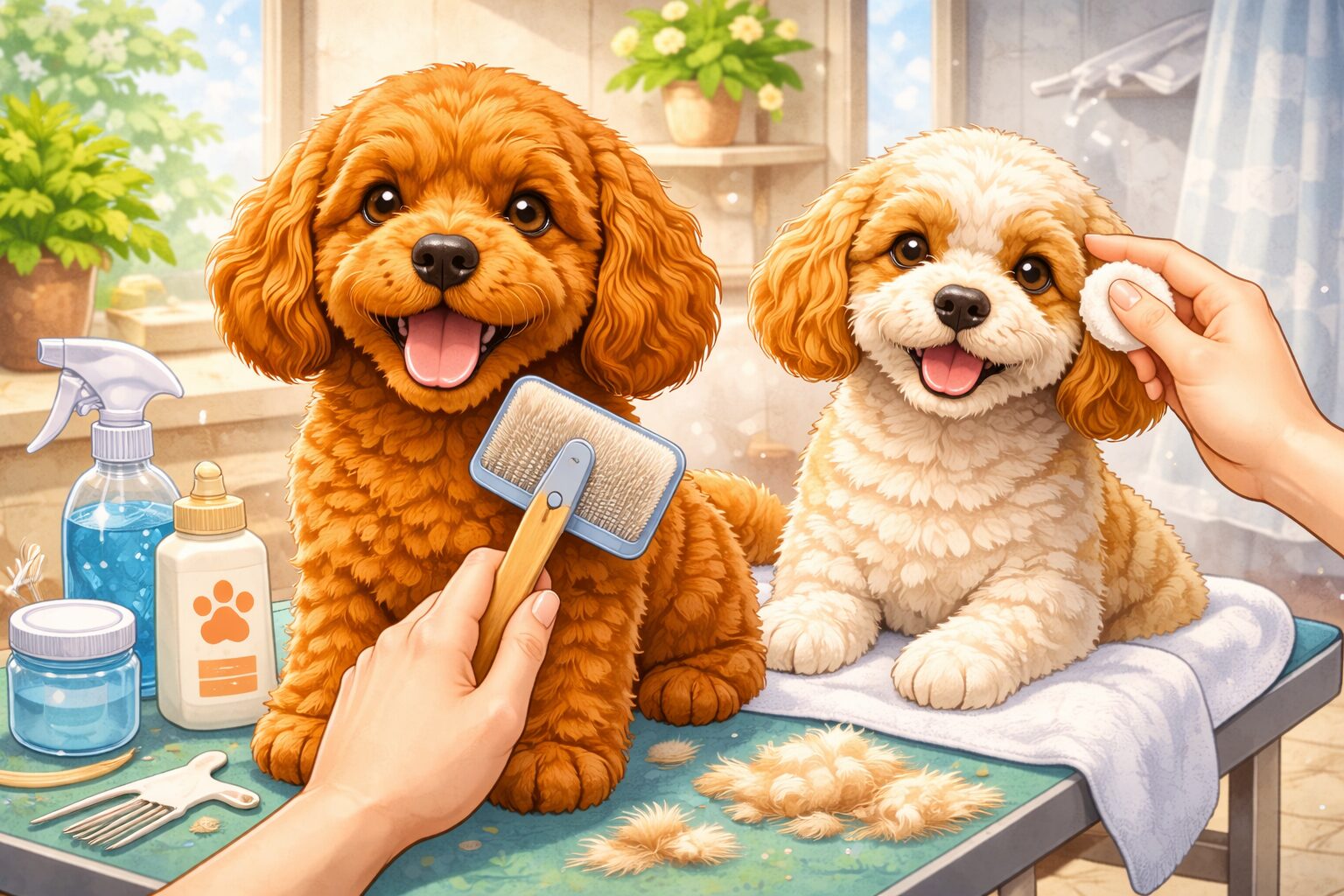 キャバプー成犬は、プードルの影響で抜け毛が少なめになりやすいです。掃除の負担が軽く感じる家庭が多いのはこの部分ですね。ただし、抜け毛が少ない=ノーケアでOKではないです。むしろ逆で、抜け毛が少ない子ほど毛が絡みやすく、毛玉になりやすいです。毛玉は皮膚の通気を悪くして、かゆみや赤みの原因にもなるので、ブラッシングは“美容”というより“健康管理”の側面が強いと思っています。