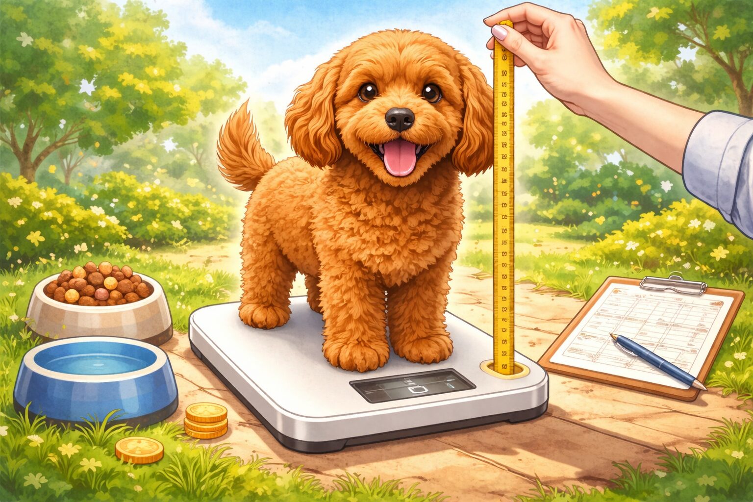キャバプー成犬は、小型犬の中でも「抱っこで移動しやすい」サイズに落ち着く子が多い印象です。一般的な目安としては、体高がだいたい25〜35cm、体重は4〜9kgあたり。ただし、ここは本当に個体差が出ます。毛がふわっとしている子ほど、見た目だけでサイズ感を判断しにくいので、数字(体高・体重)と体型(触った時の骨格感)をセットで見ていくのがコツです。