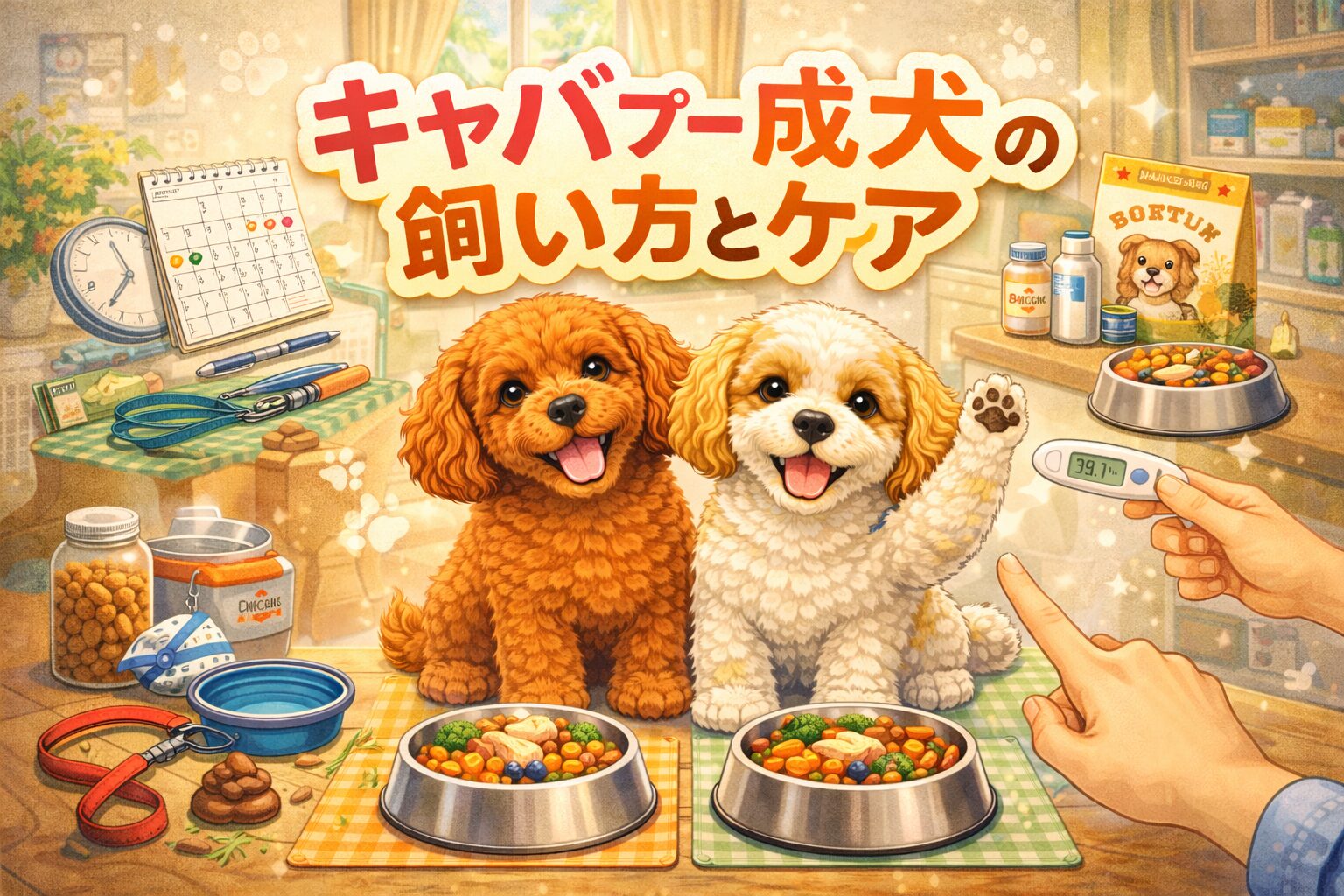 まとめ:キャバプー成犬は、サイズ感が読みやすく、性格も安定しやすい時期です。体重管理・口腔ケア・定期健診を軸にしつつ、散歩としつけをコツコツ続けると、ぐっと暮らしやすくなります。