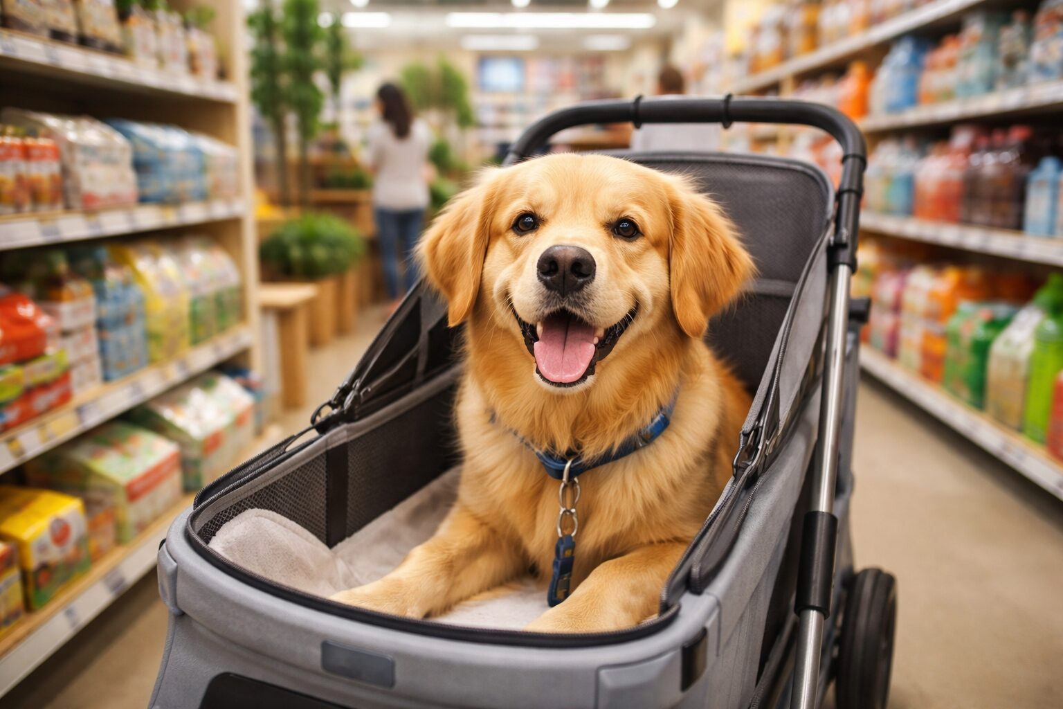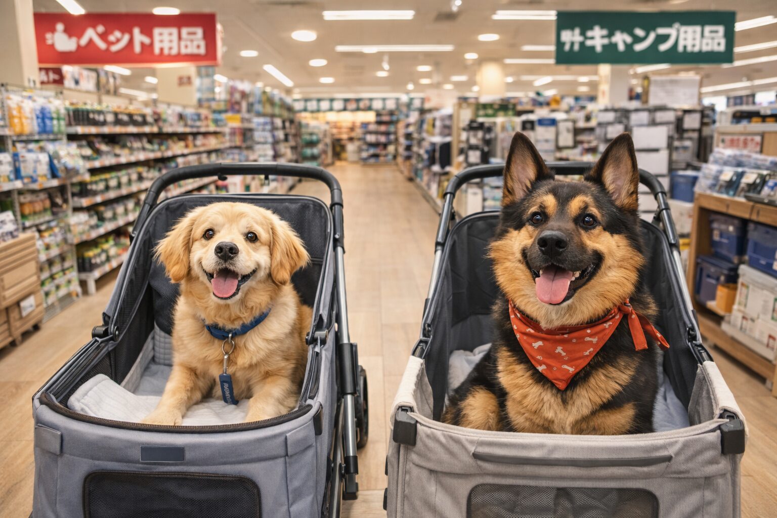 大型犬についても、店舗によっては乗せやすいタイプのカートが導入されていることがありますが、台数や対応状況は変わるので、事前確認がいちばん確実です。特に大型犬は「入店できるか」だけでなく「店内で安全に動けるか」も大事。通路が狭い、混雑がすごい、エレベーターがないなど、設備面で厳しいこともあります。