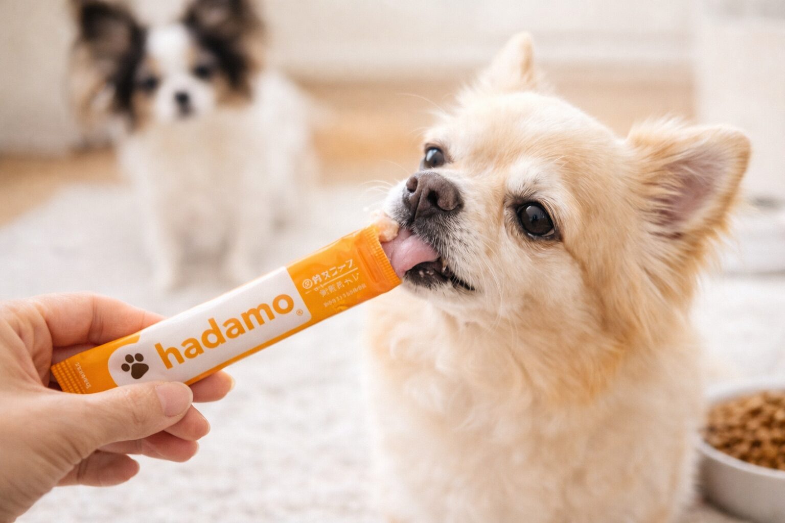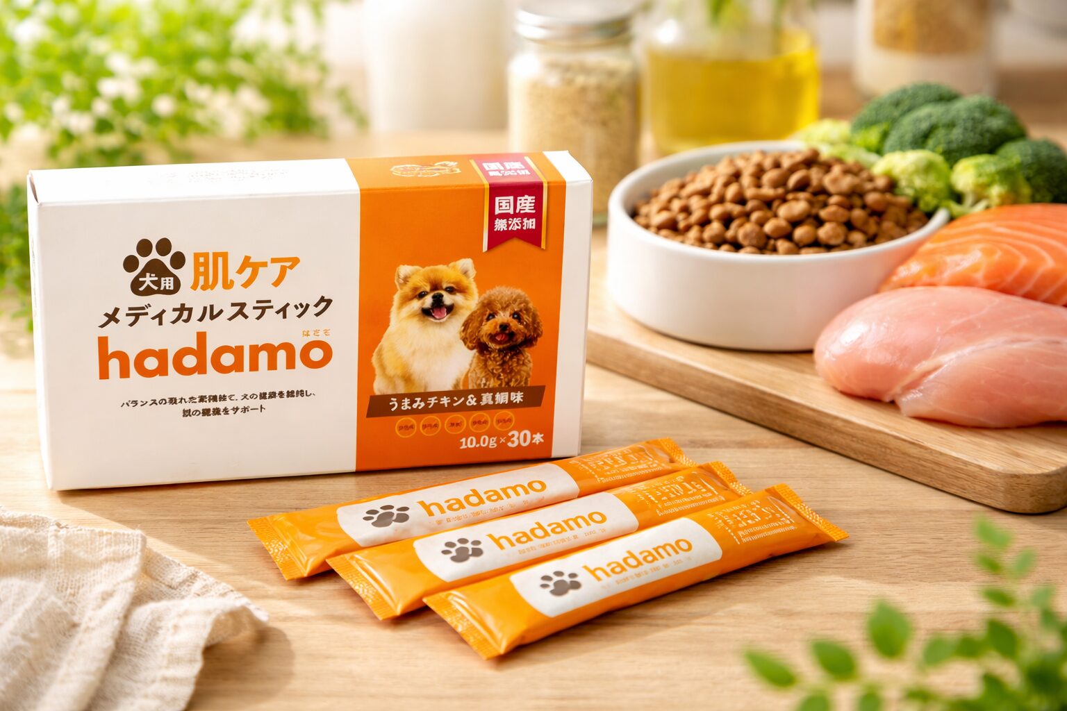 hadamoは、犬の肌ケアを目的にしたメディカルスティック型のサプリです。形としてはチュールに近いペースト状で、1日1本を目安に与える設計。ここがまず大きな特徴で、粉末サプリみたいにフードへ混ぜ込む必要がなく、犬が自分から舐めてくれやすいのが強みです。犬の皮膚ケアって、結局「続けられるか」が勝負なので、形状の勝ちパターンを最初から狙っている感じですね。