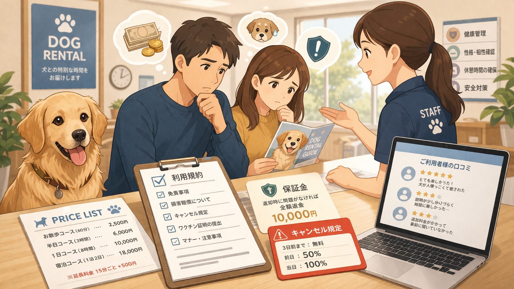 口コミや評判でまず確認したいのは、犬がかわいかったかよりも、ルール説明が明確だったか、追加費用でもめていないか、犬への接し方に配慮があったかの3点です。あなたが不安に思っている点と、口コミで繰り返し指摘されている点が一致しているなら、そこはかなり優先して確認したほうがいいです。