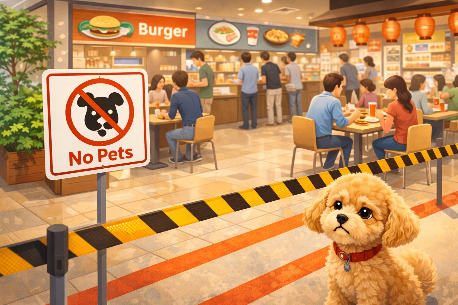 ペット同伴OKの店舗でも、店内すべてがOKとは限りません。特に食品売り場やフードコート、飲食店の区画はNGになりやすいです。このあたりは「あなたの子が大人しいから大丈夫」という話ではなく、ルールとして線引きされていることが多いので、入口付近の掲示や店内サインに従いましょう。