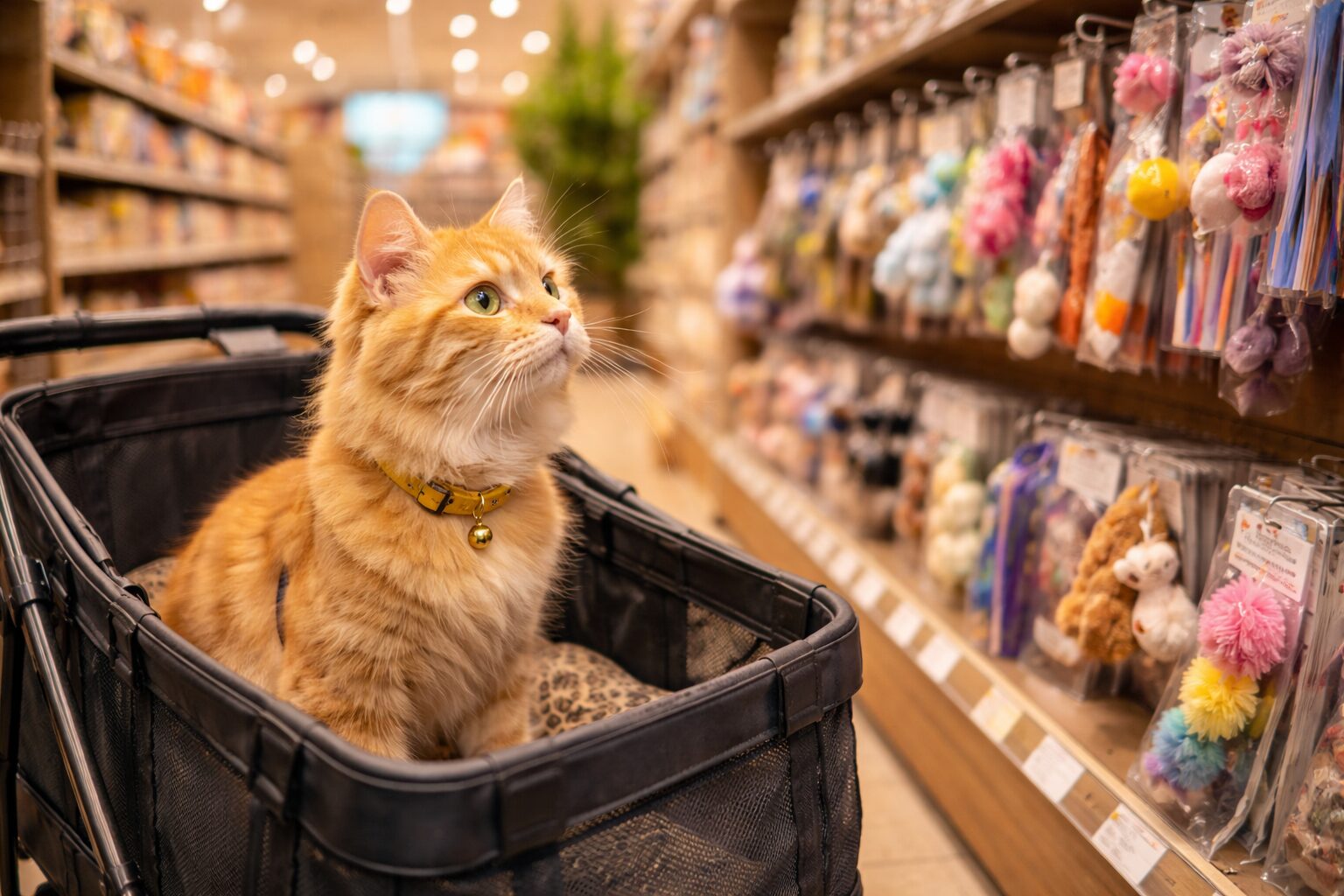 ペット用品売り場って、においが強い商品(おやつ、缶詰、ジャーキー)も多くて、ワンちゃんのテンションが上がりやすいです。カートの中で立ち上がったり、前のめりになったりする子は、飛び出し対策をしっかり。猫ちゃんは静かに固まりやすいので、バッグの中を暗めにして落ち着けると良いです。