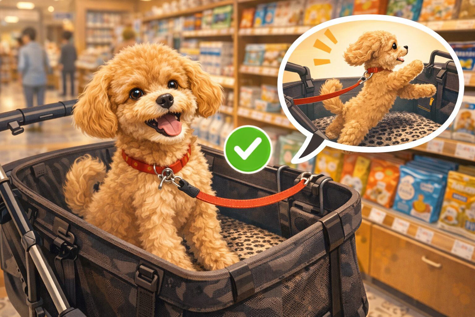 基本は、リードは必須、そしてカートの中でリードを短めに固定するのが安心です。固定といっても、首が苦しくなるほど短くするのはNG。飛び出しにくい長さを作って、急に立ち上がったときに外へ出ないようにするイメージです。ハーネス派のあなたは、首輪よりもハーネスのほうが抜けにくい子も多いので、店内ではハーネスのほうが安心な場面もあります。